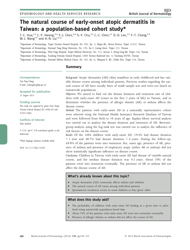 🚨【異位性皮膚炎 】是門診常見疾病中,病程可能最長,也最影響生活品質的皮膚病。心急的家長常會問:「醫師這什麼時候才會好?」根據我與 黃千耀醫師-皮膚專科 合作,利用台灣健保資料庫,發表在英國皮膚科學雜誌 British Journal of Dermatology 的論文(請見附圖),兩歲以內發病的小朋友,約兩成病程小於一年,五成小於四年,而約七成的病人十歲以前會達到緩解。