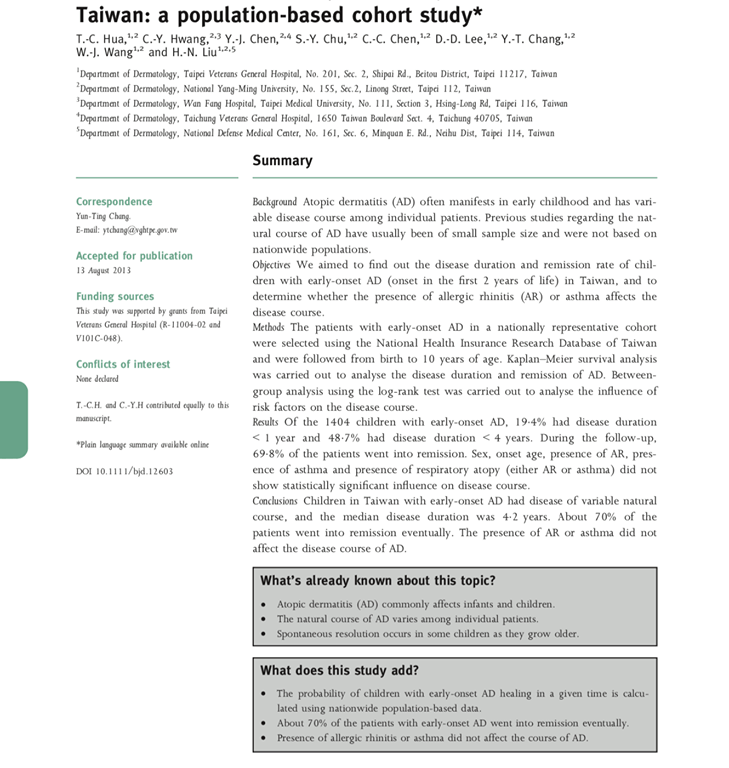 🚨【異位性皮膚炎 】是門診常見疾病中,病程可能最長,也最影響生活品質的皮膚病。心急的家長常會問:「醫師這什麼時候才會好?」根據我與 黃千耀醫師-皮膚專科 合作,利用台灣健保資料庫,發表在英國皮膚科學雜誌 British Journal of Dermatology 的論文(請見附圖),兩歲以內發病的小朋友,約兩成病程小於一年,五成小於四年,而約七成的病人十歲以前會達到緩解。