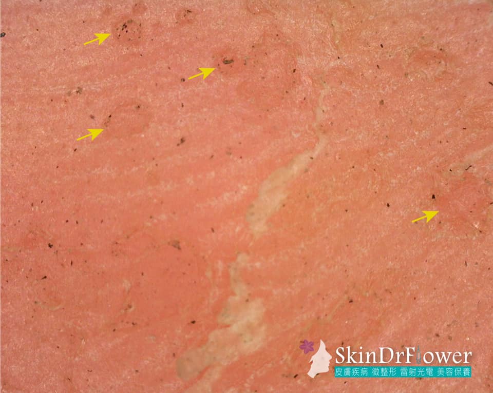 ,用皮膚鏡來看,腳底有許多小凹洞(如圖一黃箭頭處)。正確的診斷是足蹠蠹蝕症(發音為足直肚食正),英文名Pitted Keratolysis,又稱凹陷性角質溶解症。