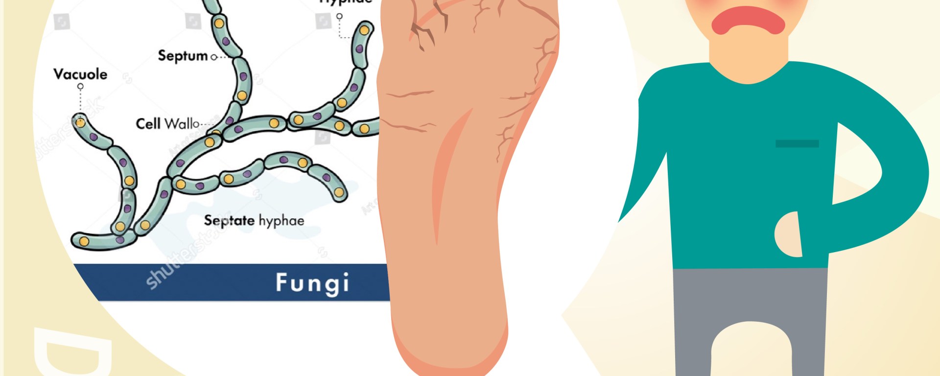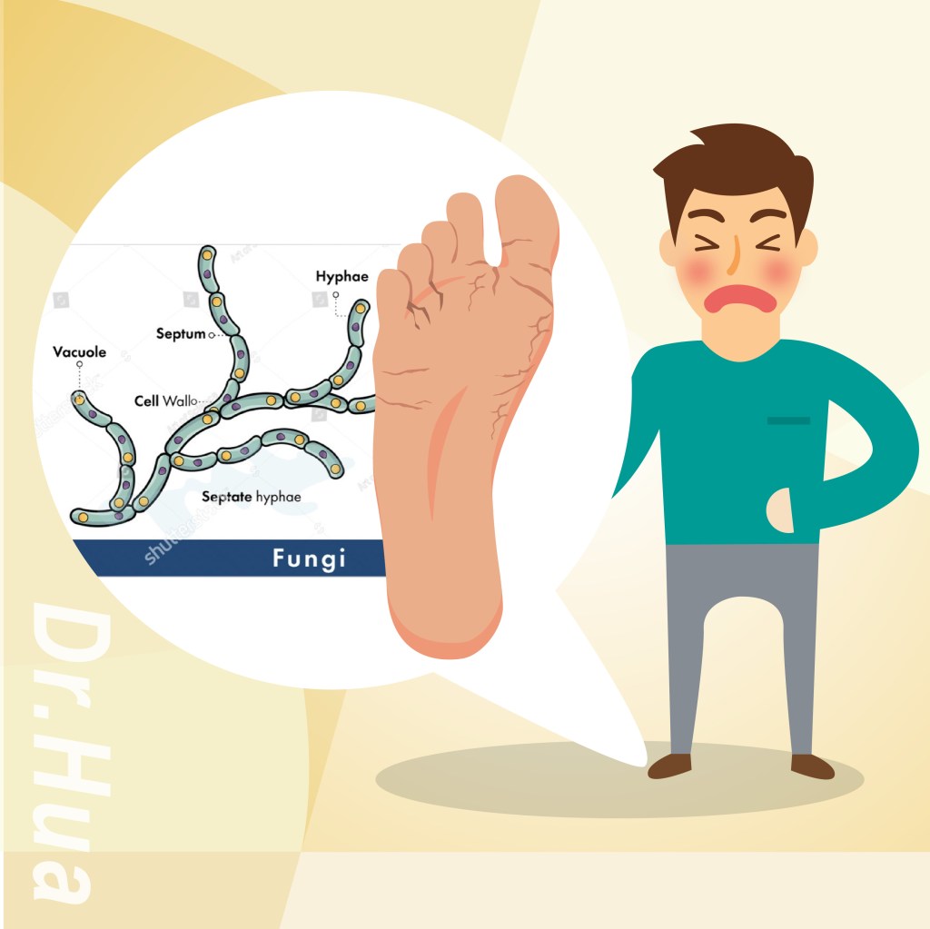 如果感染到腳, 就是香港腳 (足癬)。症狀包括腳縫脫皮、起水泡或有白色糜爛、腳底脫皮或角質增厚等情形。香港腳不一定會癢,容易忽略病情,延後治療。